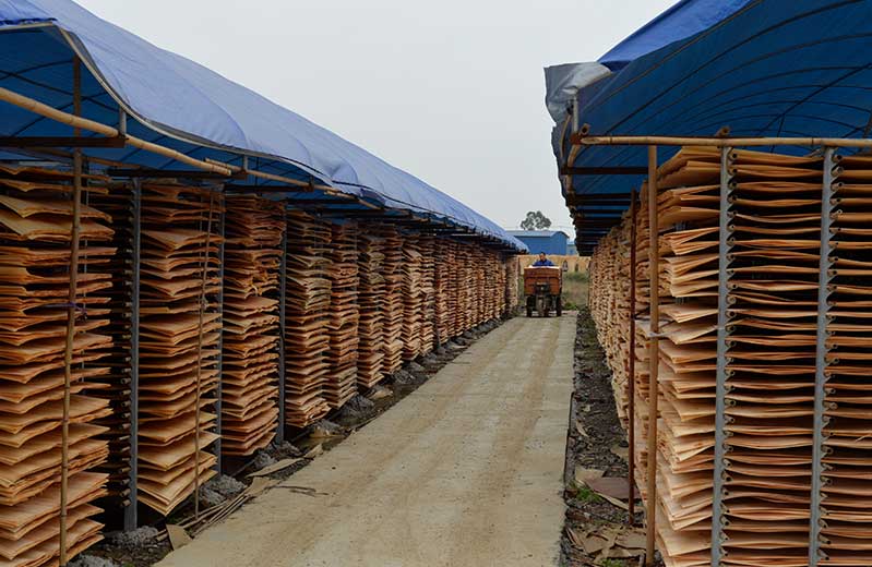 2:裁切和旋切以后的木層都含有比較大的水分,因此,大規(guī)模的生產(chǎn)我們要通過木材烘干機進行烘干處理,烘干后的木層比較脆,因此,要自然放置2-3天,可以保證木層的韌性。怪獸木業(yè)單板晾曬干燥i,擁有百畝晾曬單板的場地。