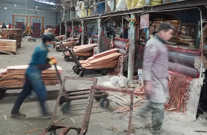 1:選擇**原木材料,原木旋切成片,工長測試剛剛旋切下來的單板厚度。將原木按照一定的層厚度進行水平面的切割旋切,根據(jù)模板的尺寸大小才裁切成比例相同的木層。