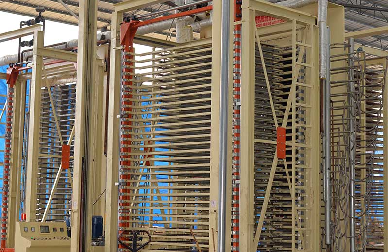 6:熱壓成型處理:經(jīng)過涂膠鋪設(shè)好的模板層,通過熱壓工藝進行壓平。傳統(tǒng)的加熱時采用了鍋爐水傳到熱進行加熱,現(xiàn)代化設(shè)備室采用了電加熱,壓平后,可以增加建筑模板的密實度,成型比較規(guī)則,提高了模板的使用質(zhì)量。采用先預壓再熱壓的工藝,大程度降低坯板錯位的幾率,再施以合理的壓力和溫度熱壓,保證了每一張建筑模板均有好的膠合強度和硬度。